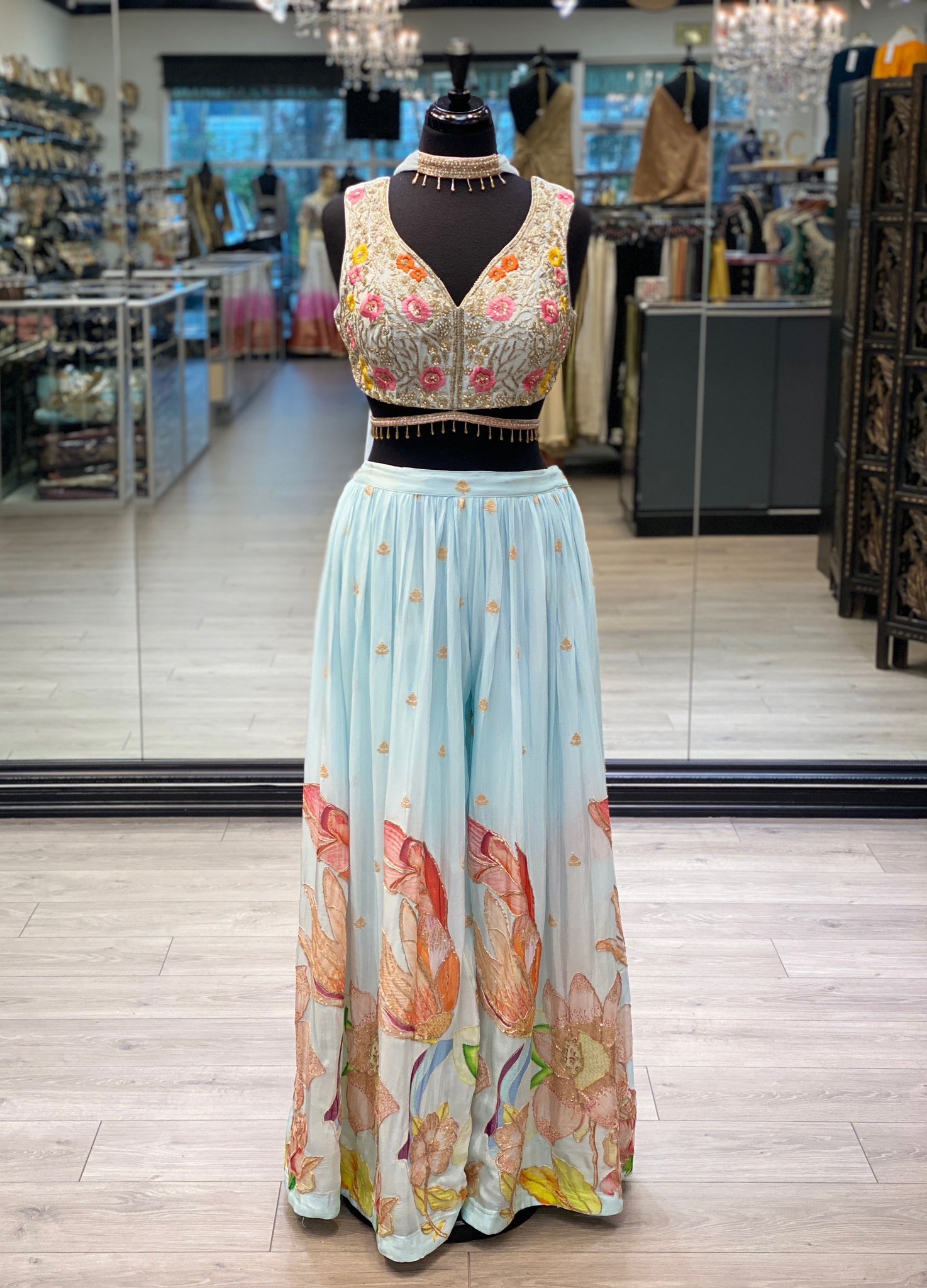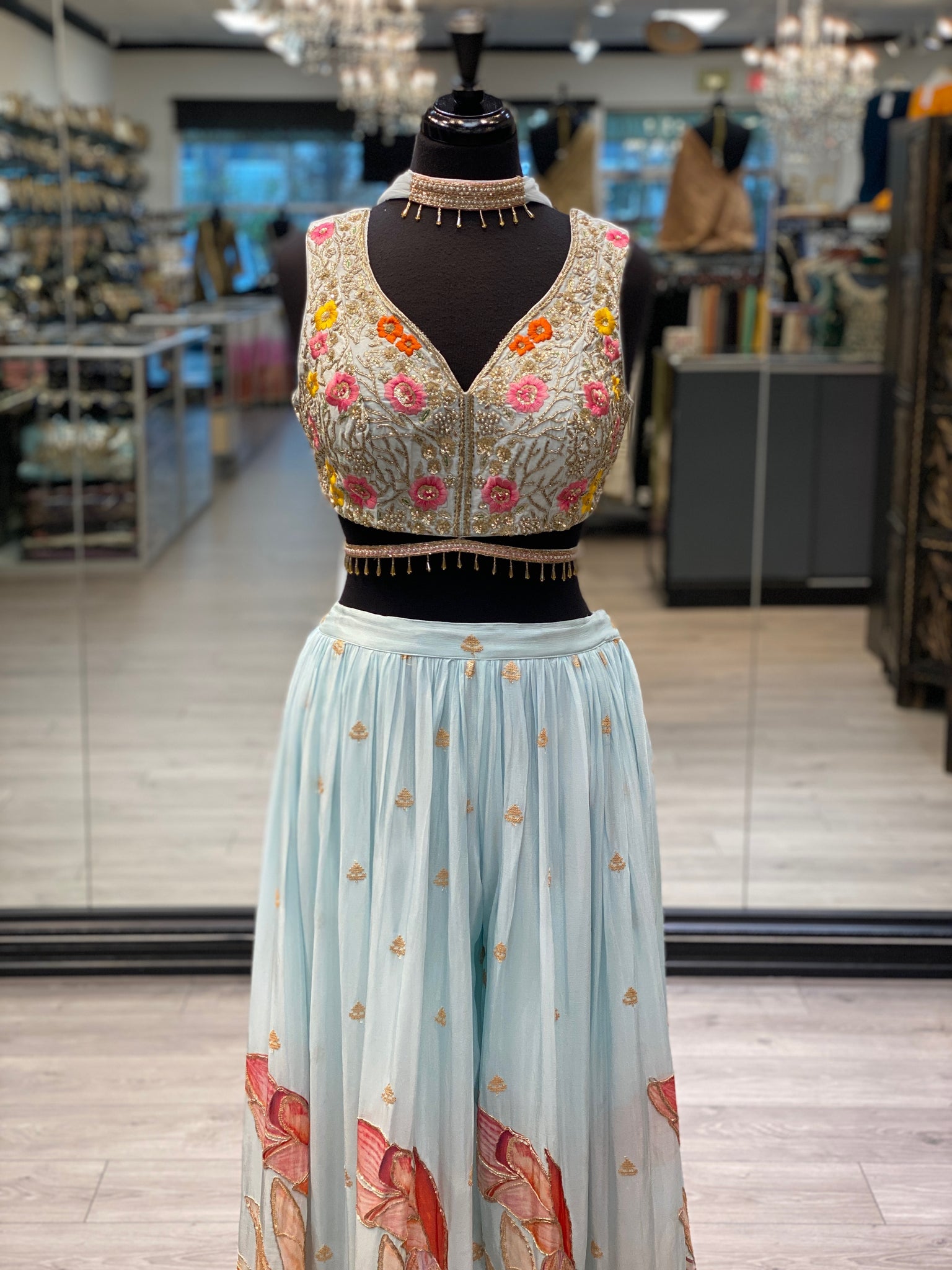 If you're looking for an outfit to turn heads at your next event, look no further! This stunning printed blouse has delicate gold embroidery with a pop of pink, orange and yellow flowers. Along the bottom is a delicate strand of beaded tassels. This ensemble is paired with georgette printed sharara pants and a neck-tie style dupatta.