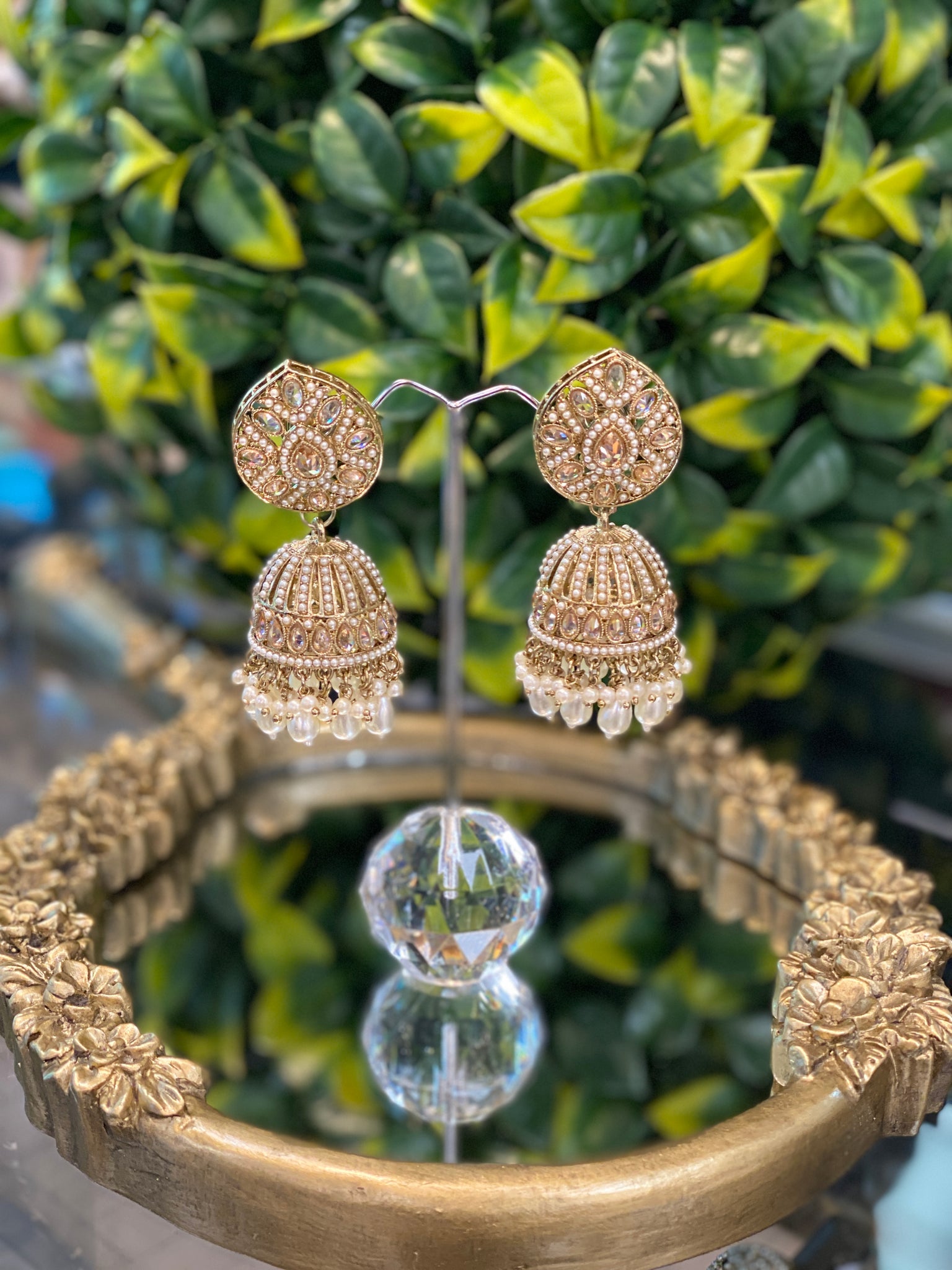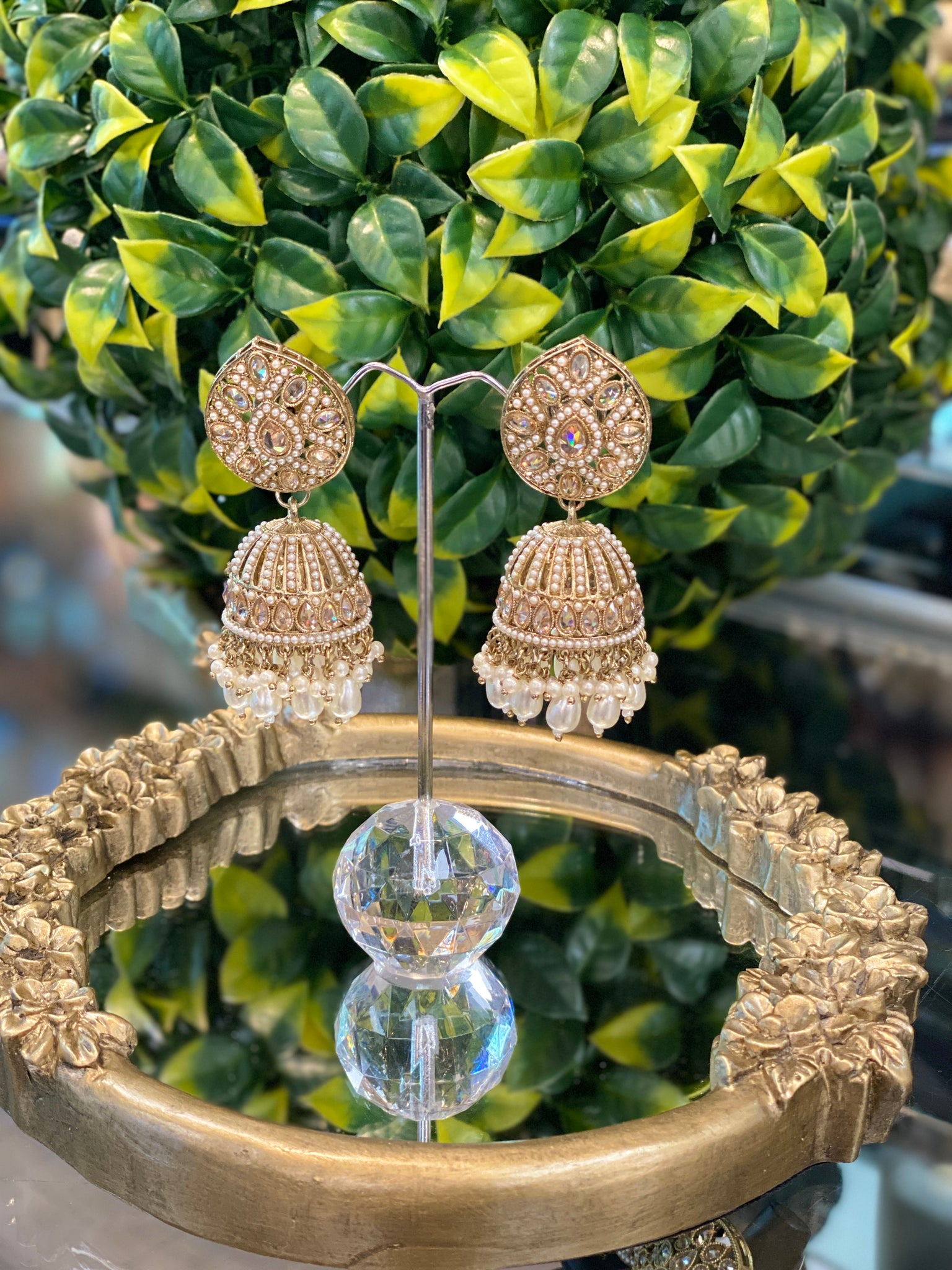 Perfectly designed jhumkis with gold polki stone work and crispy white pearls all over creating a perfect look.