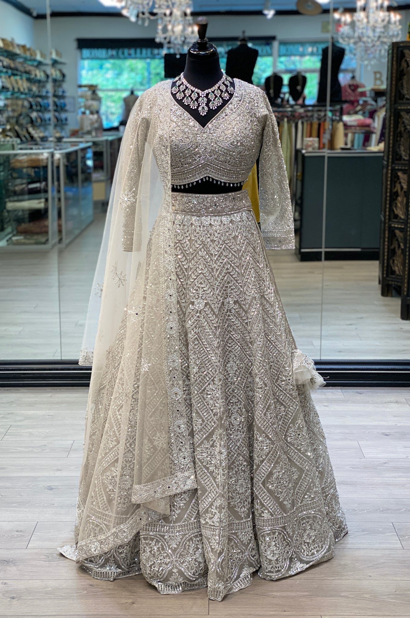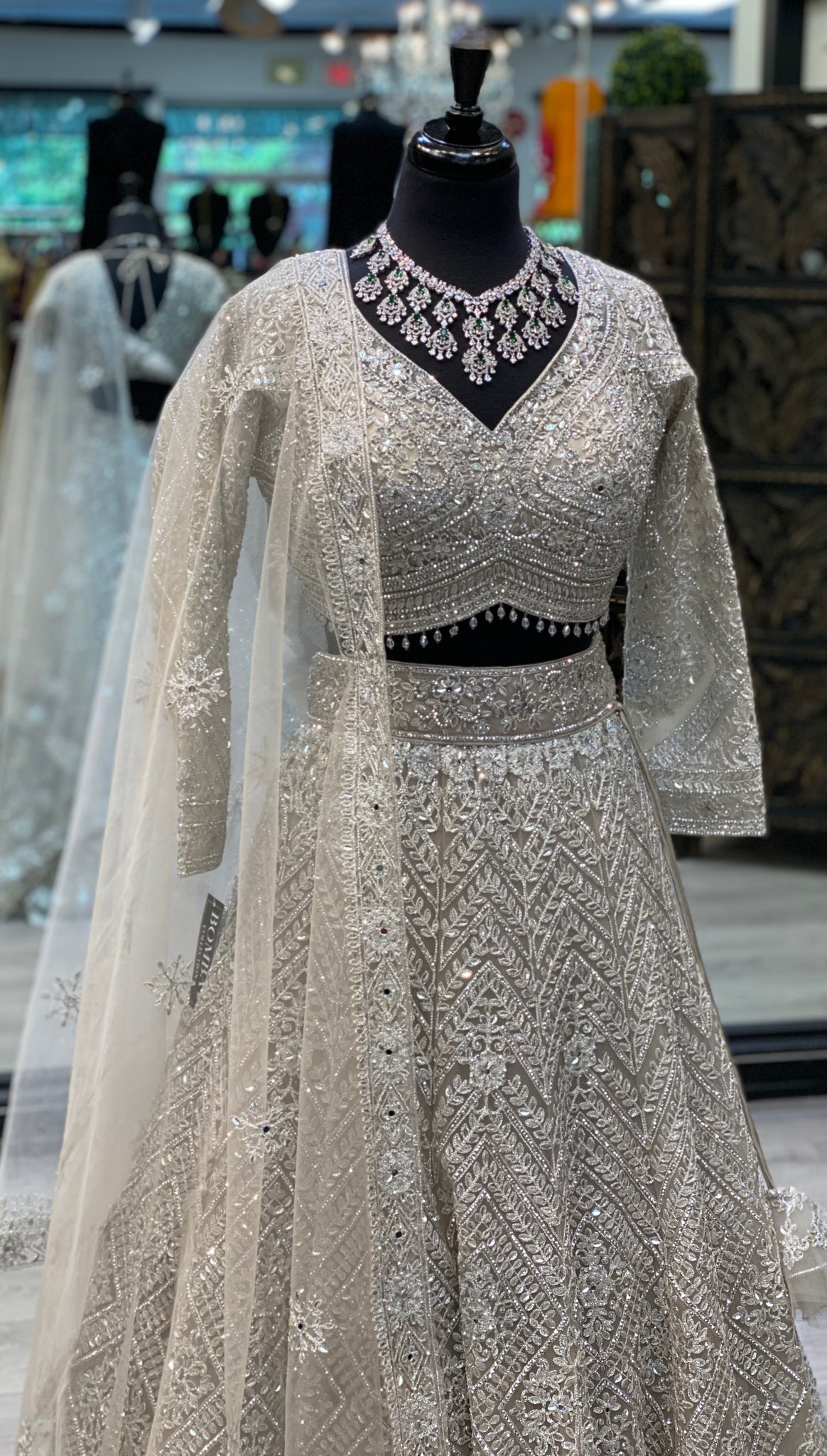 A beautiful lehenga with loads of shiny stone work patterned beautifully perfect for reception.