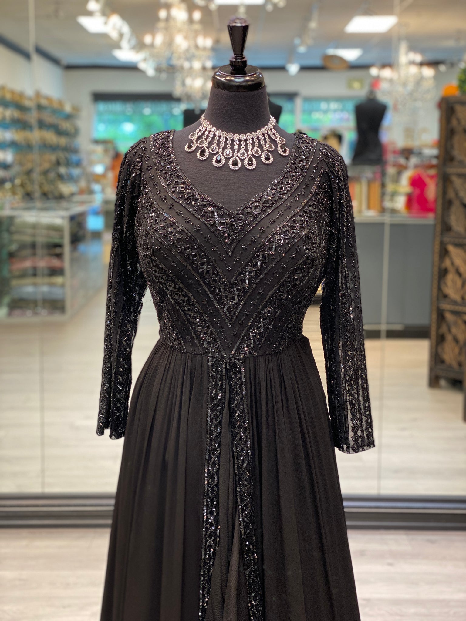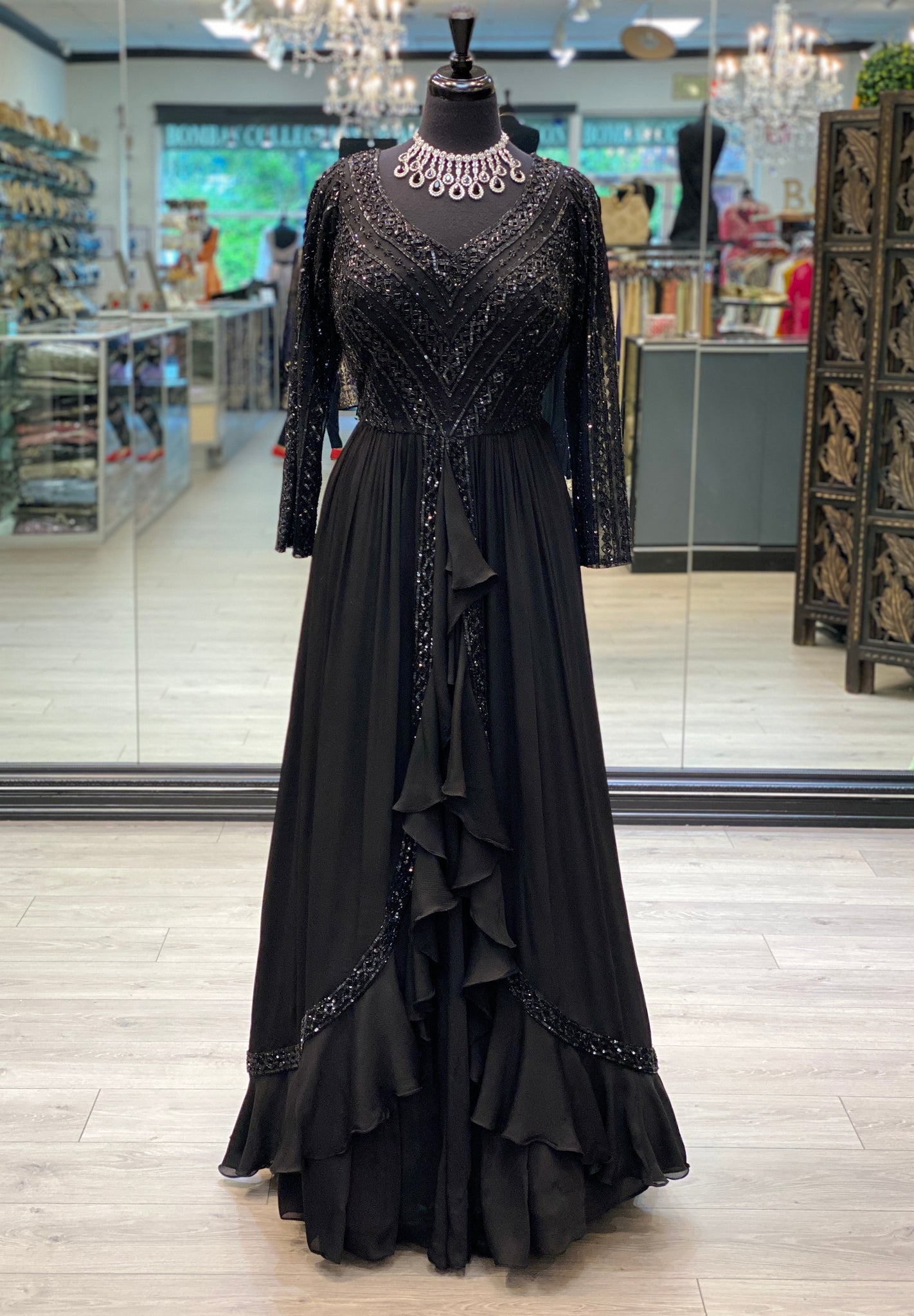 A masterpiece in black with long high-low ruffle top designed with black embroidery. The outfit comes with black lehenga bottoms to complete the look.