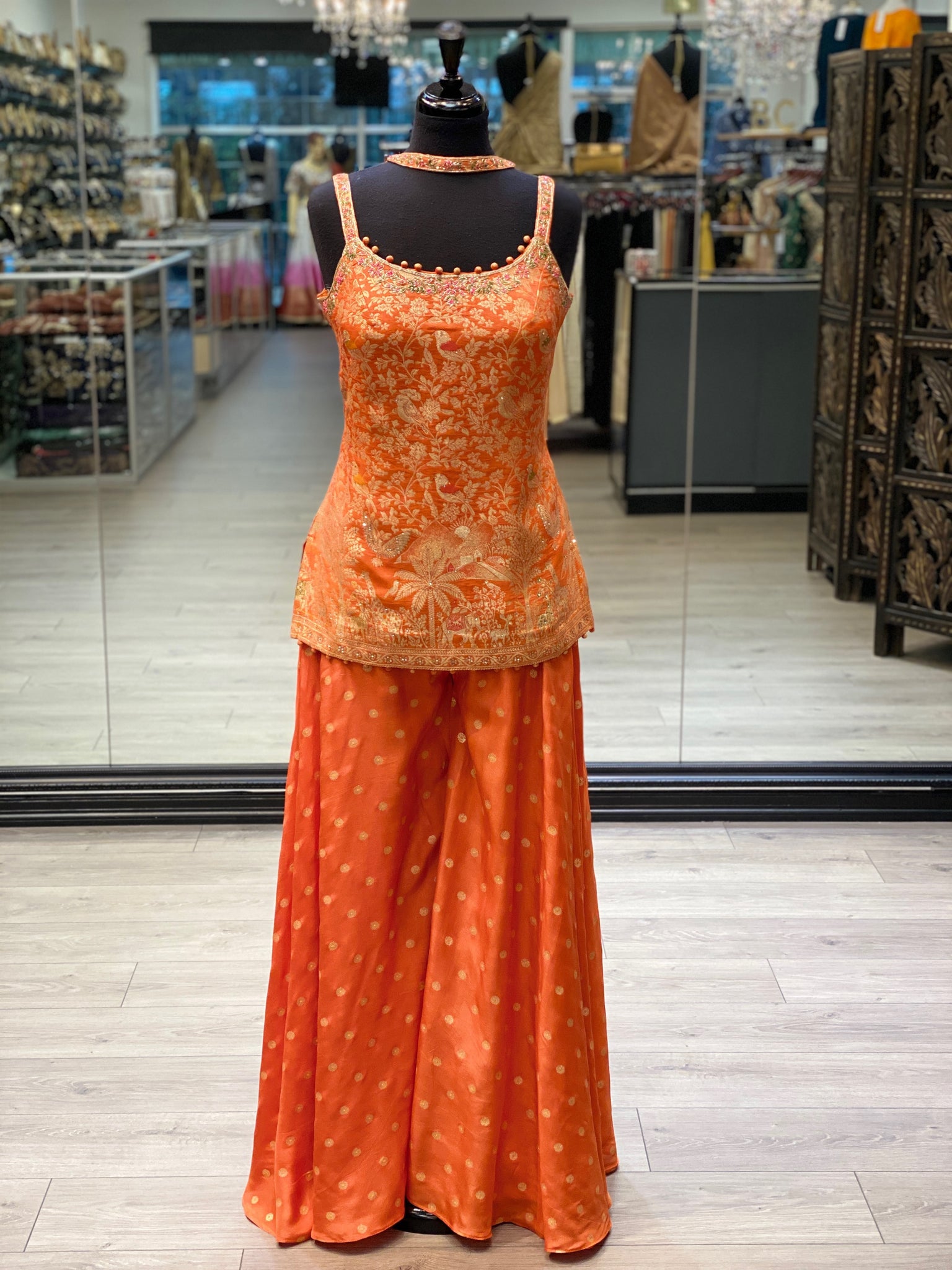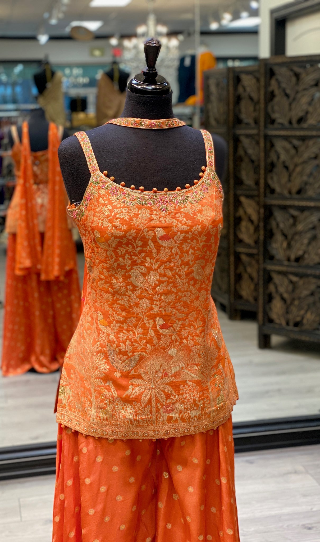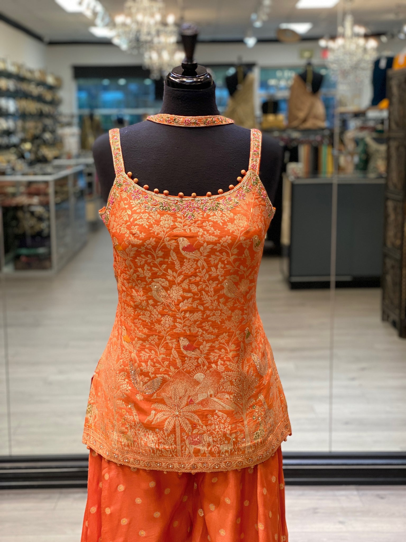 An orange banarsi printed long kameez top paired with printed palazzo pants and a neck-tie style dupatta.