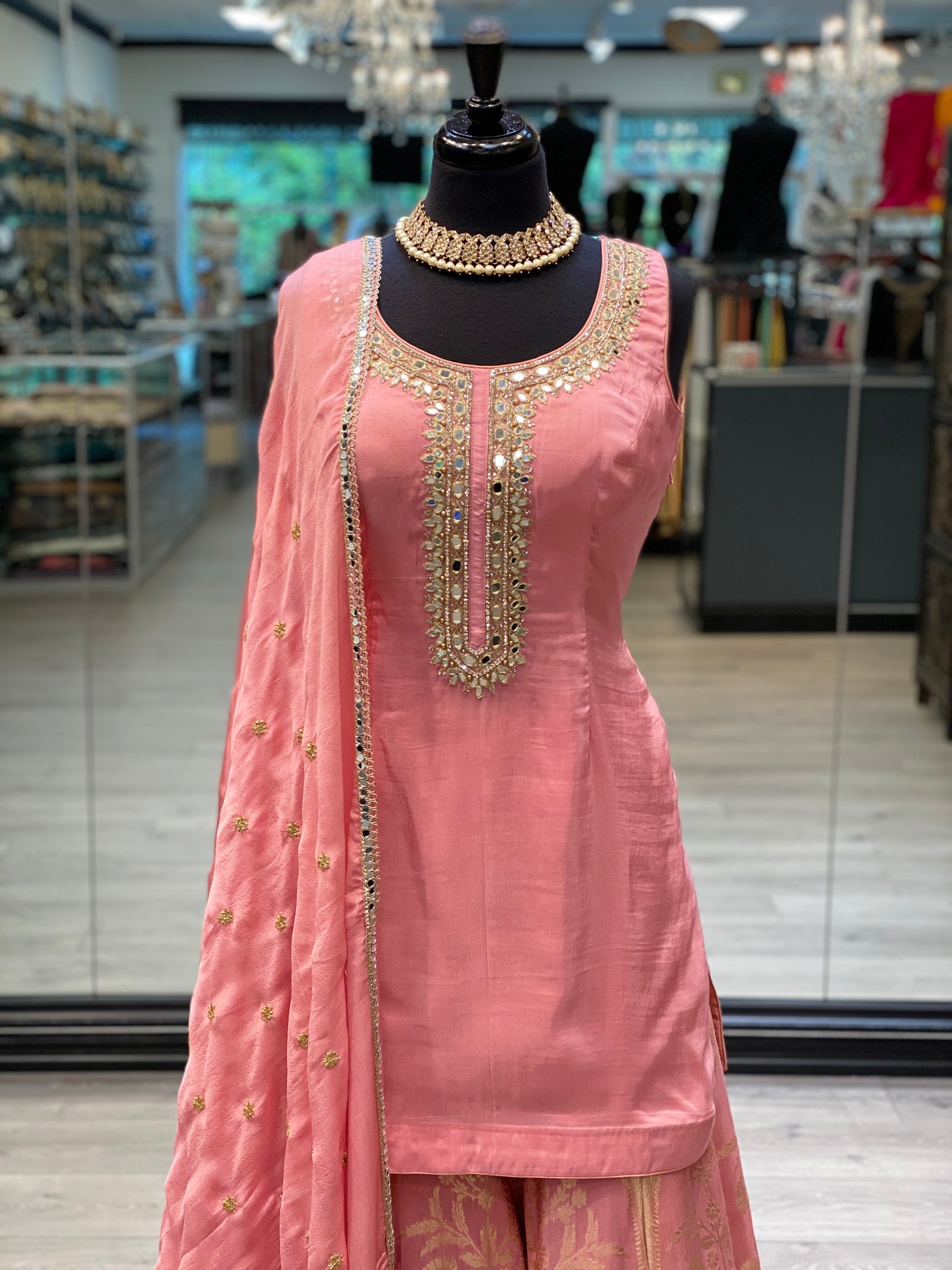 An evergreen prink silk outfit with mirror work on the top. It comes with georgette embroidered dupatta and stunning banarsi sharara to make the outfit look absolutely gorgeous. For our sleeve lovers, the ensemble comes with 3/4th sleeves fabric to attach.