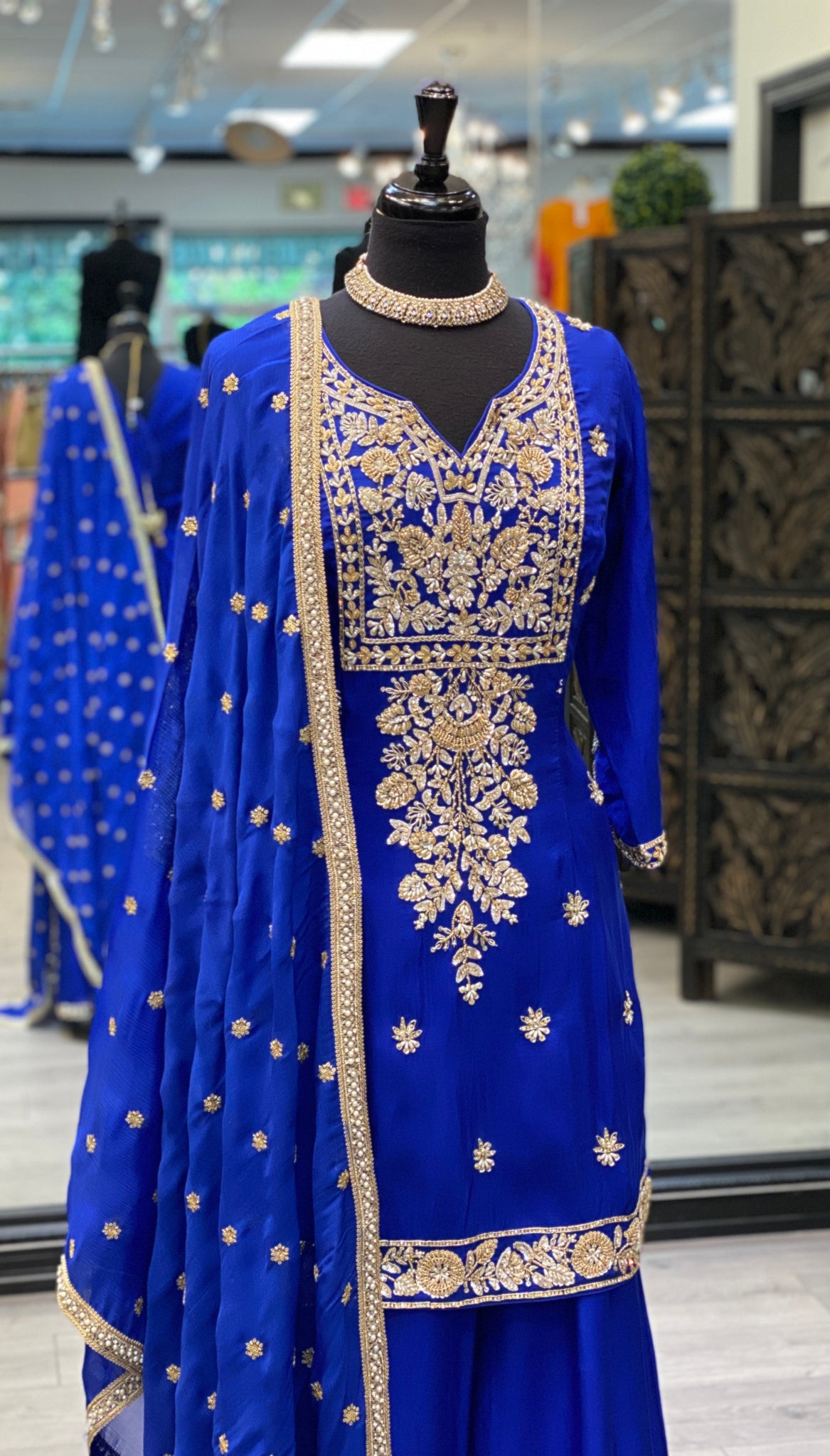 A beautiful masterpiece with detailed hand-embroidery including pearls, sequins, beads and motifs. The matching work is done on the sharara to complete the look. It includes georgette dupatta with sequins and gotta border.