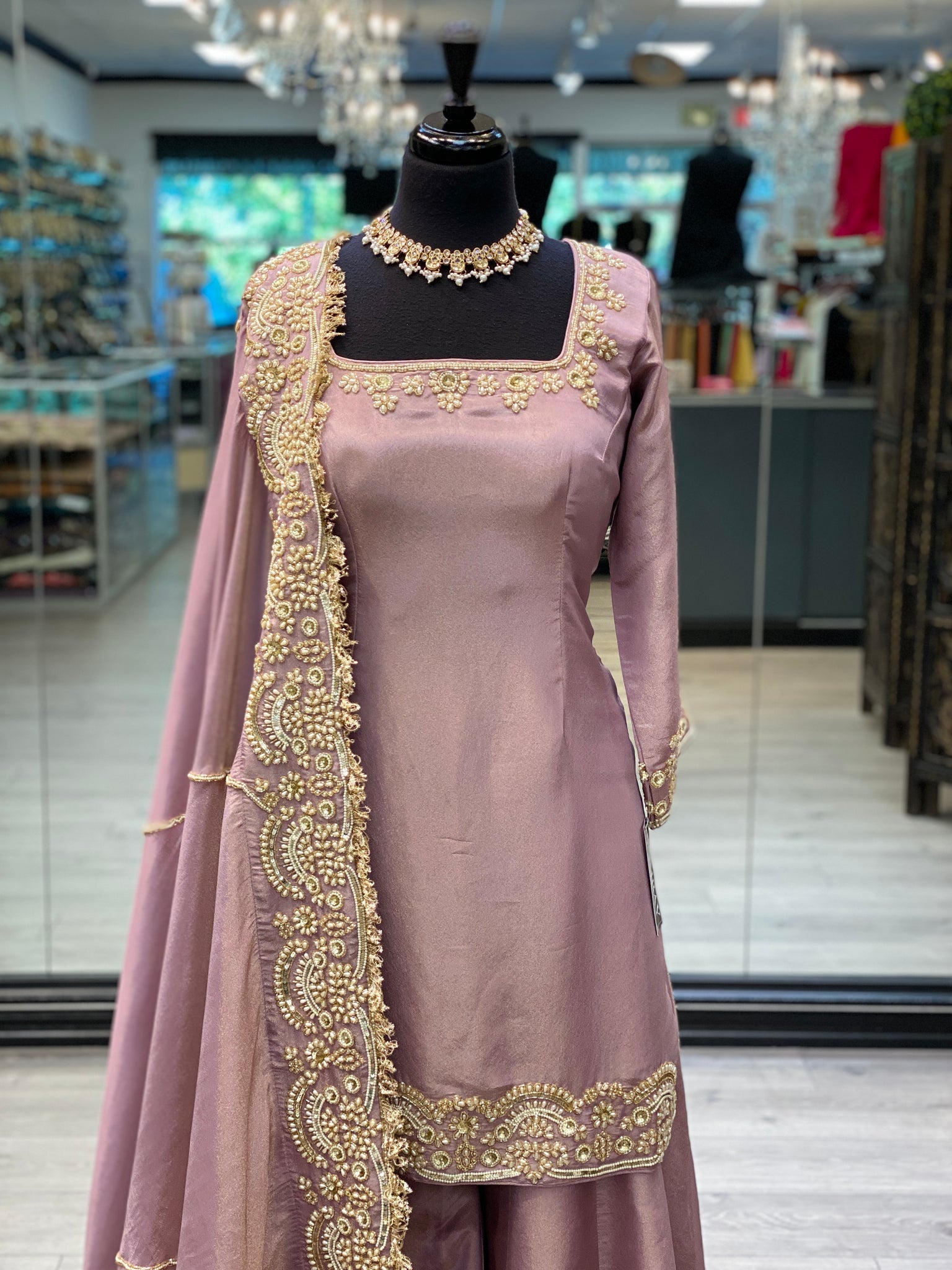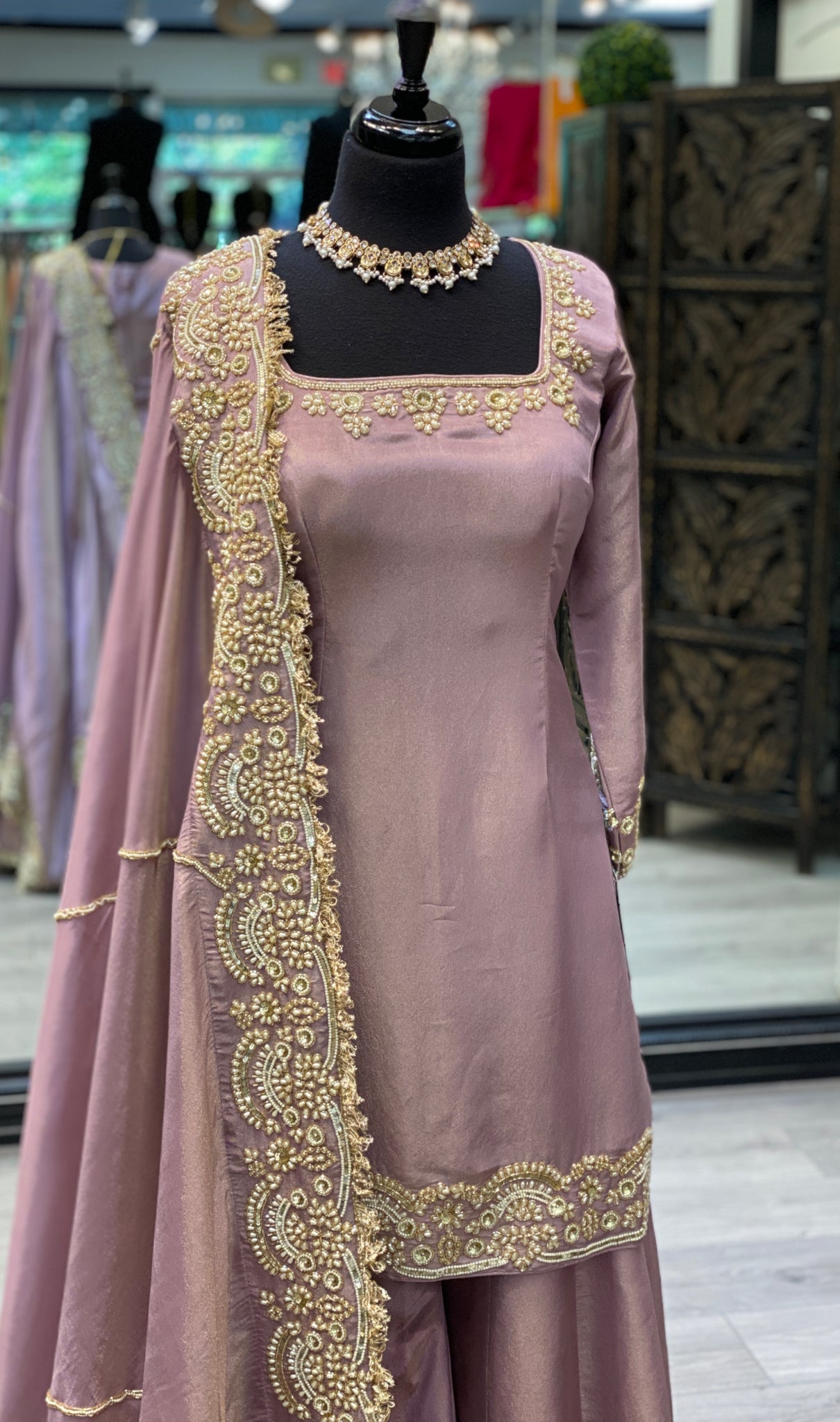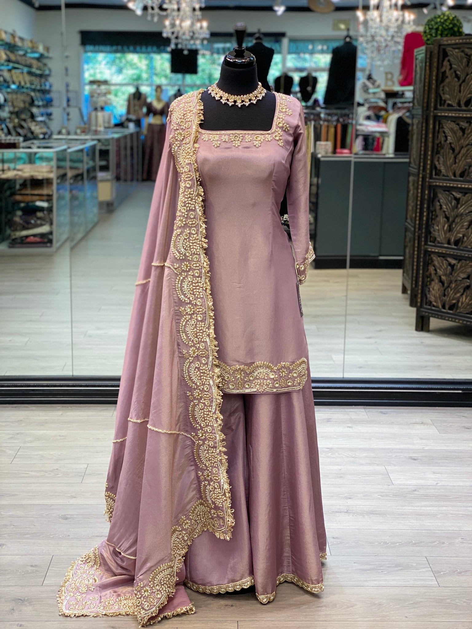 An absolutely gorgeous sharara suit with hand-embroidery on the borders of the outfit including dupatta to make it very grand and sophisticated.