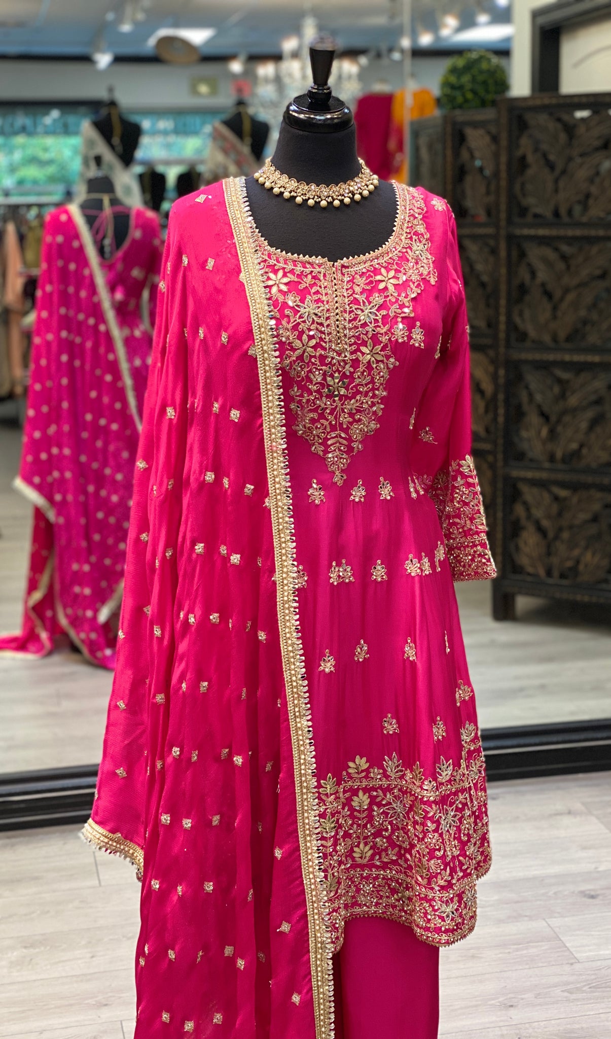 A traditional yet elegant hot pink peplum style outfit with detailed hand-embroidery all over. It comes with matching pants and georgette dupatta.