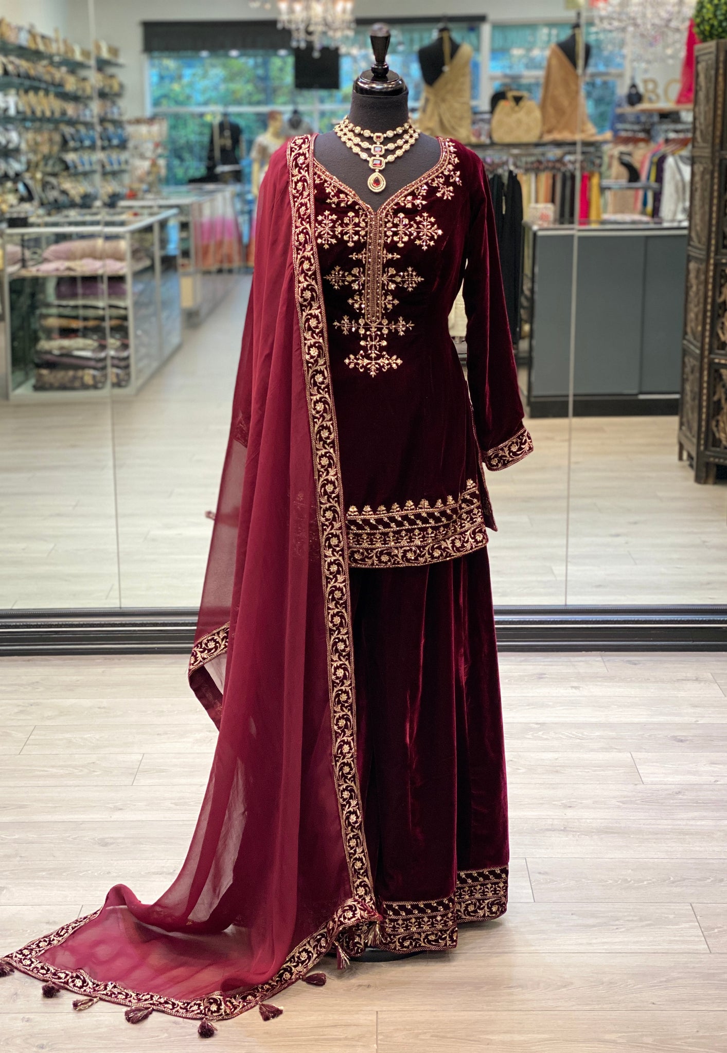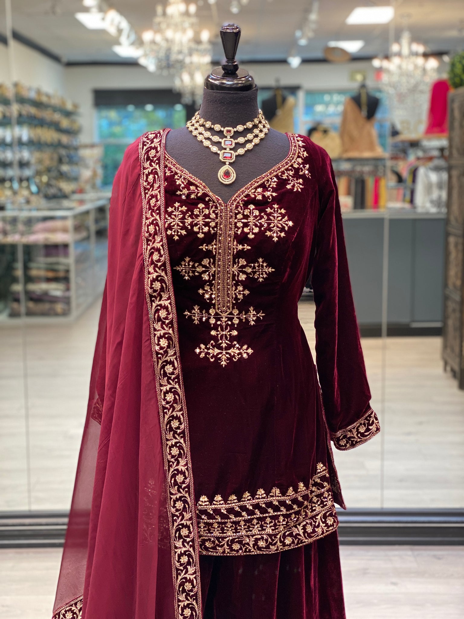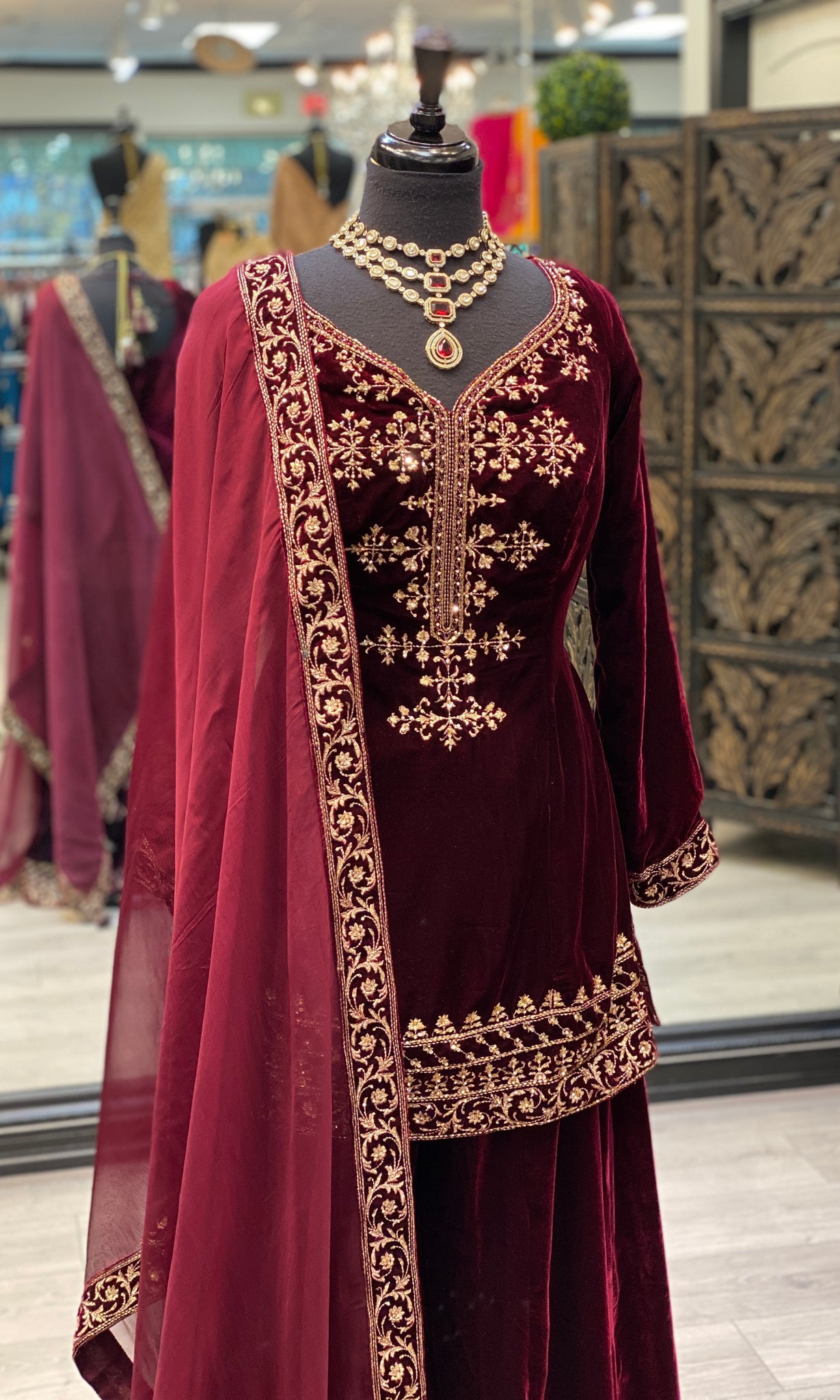 A beautiful velvet maroon sharara suit with gold gotta embroidery and stones. It comes with soft organza dupatta with velvet borders and tassels.