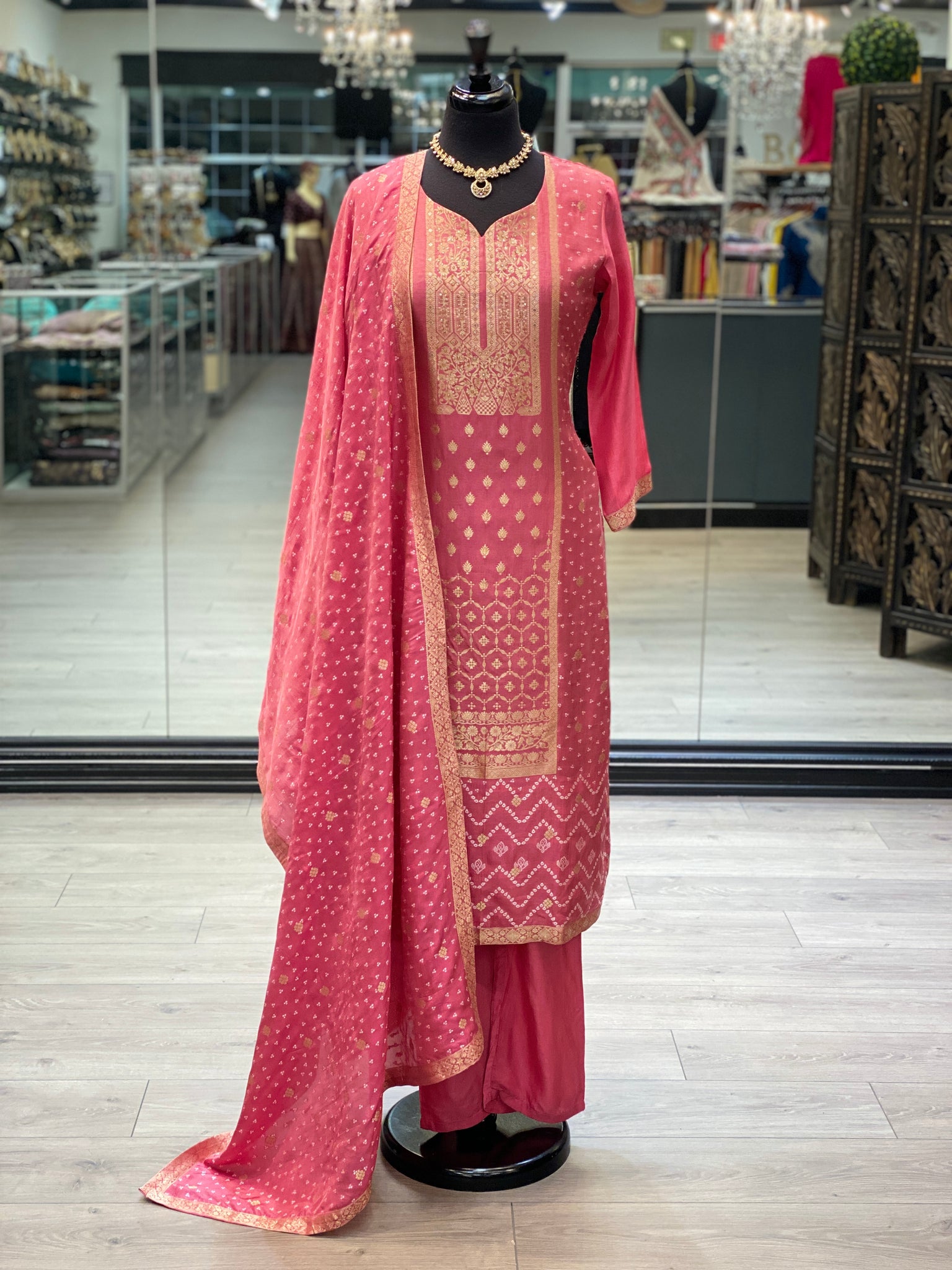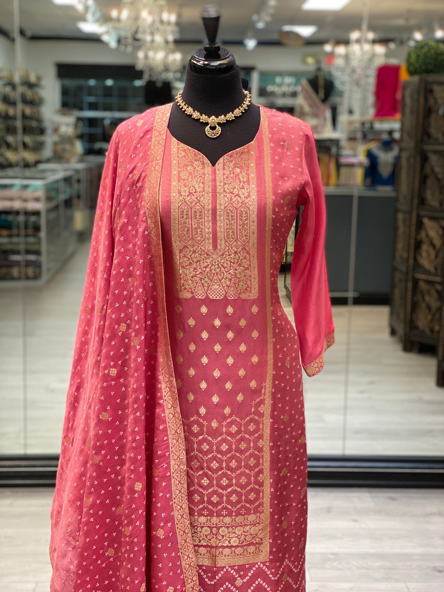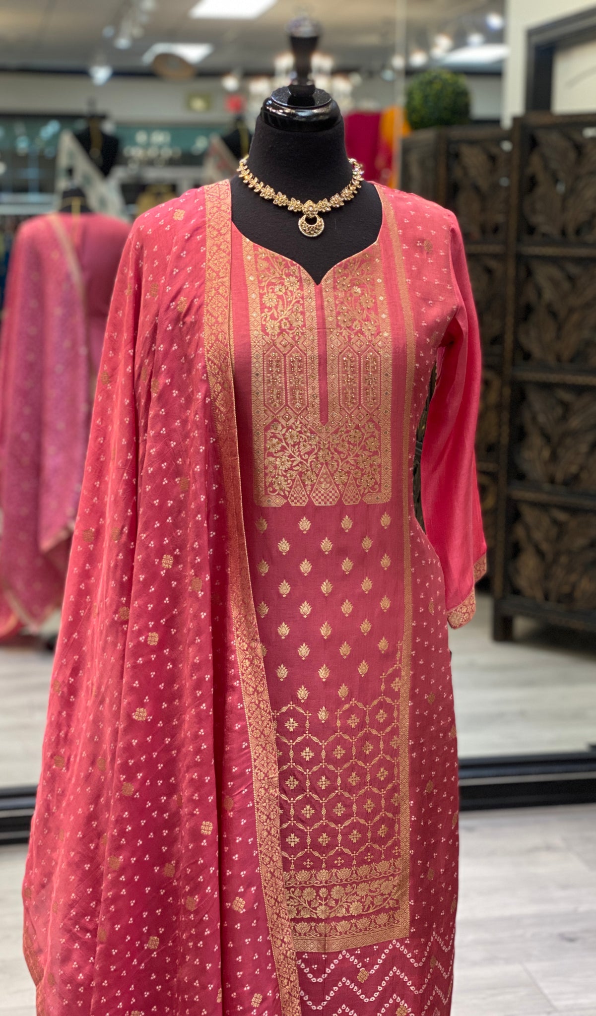 An elegant coral peach banarsi printed suit with silk pants and banarsi dupatta. It is a perfect outfit for any occasion.