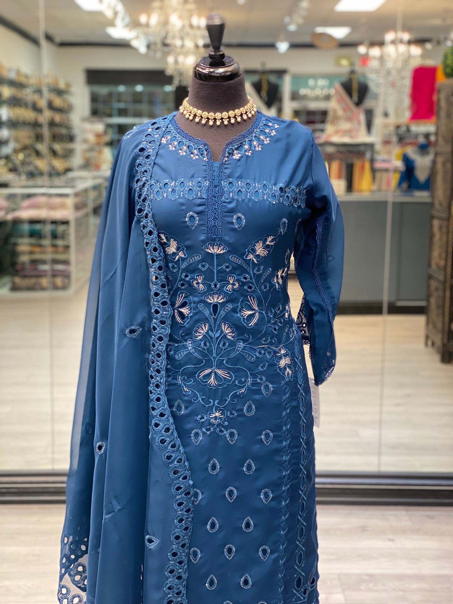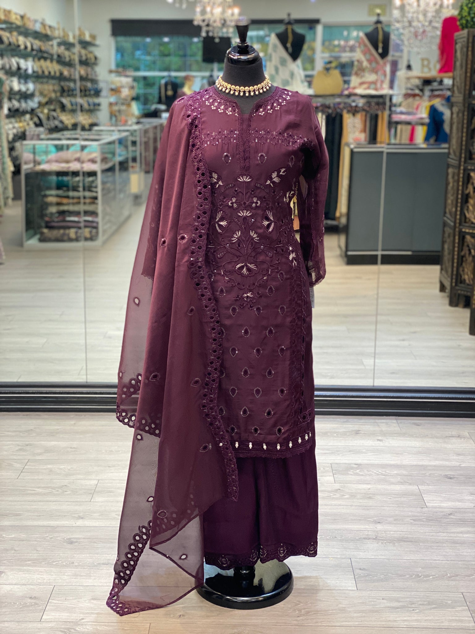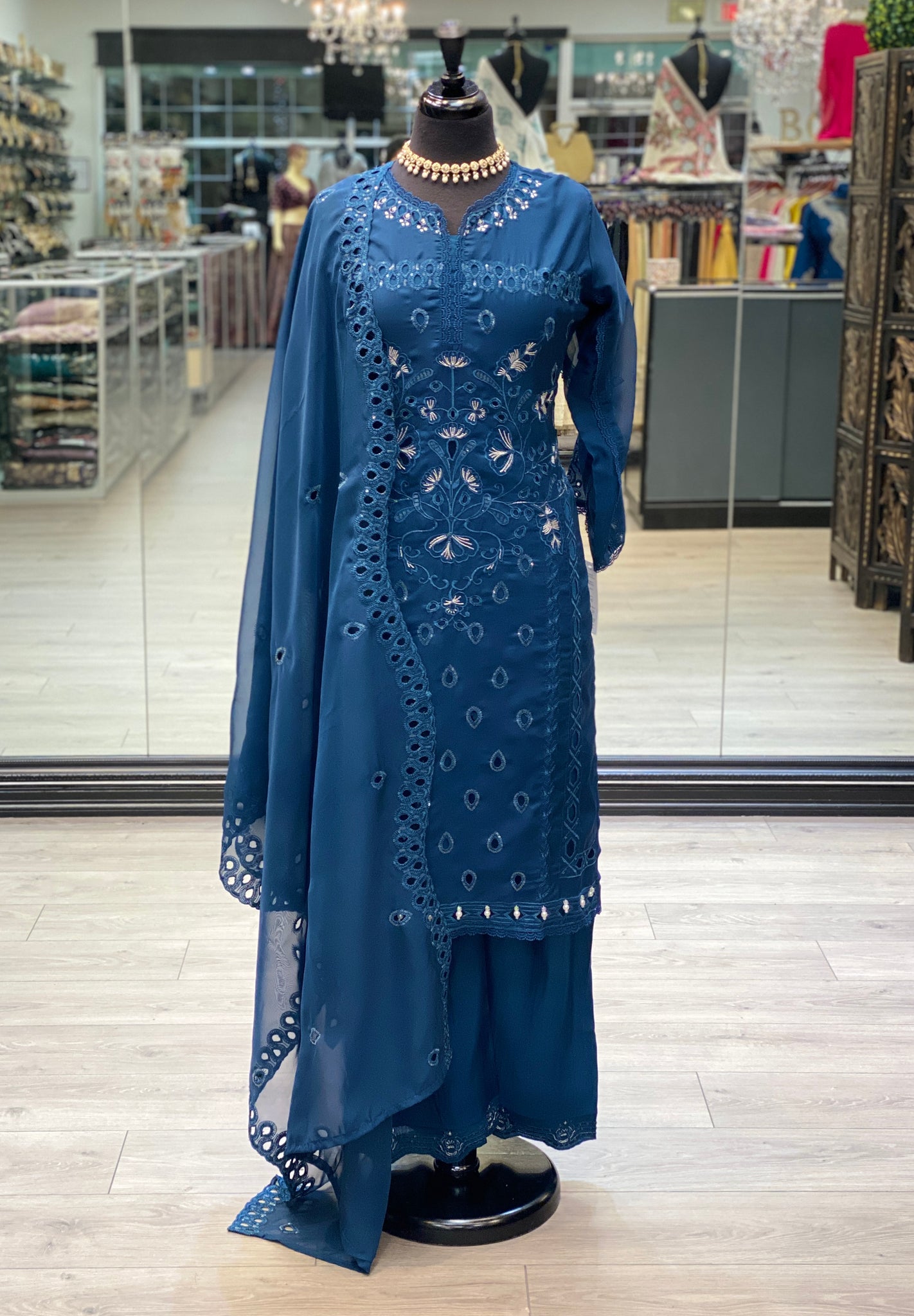 A casual yet elegant soft organza casual suit. It has sequins and detailed thread work. It comes with matching pants and dupatta.