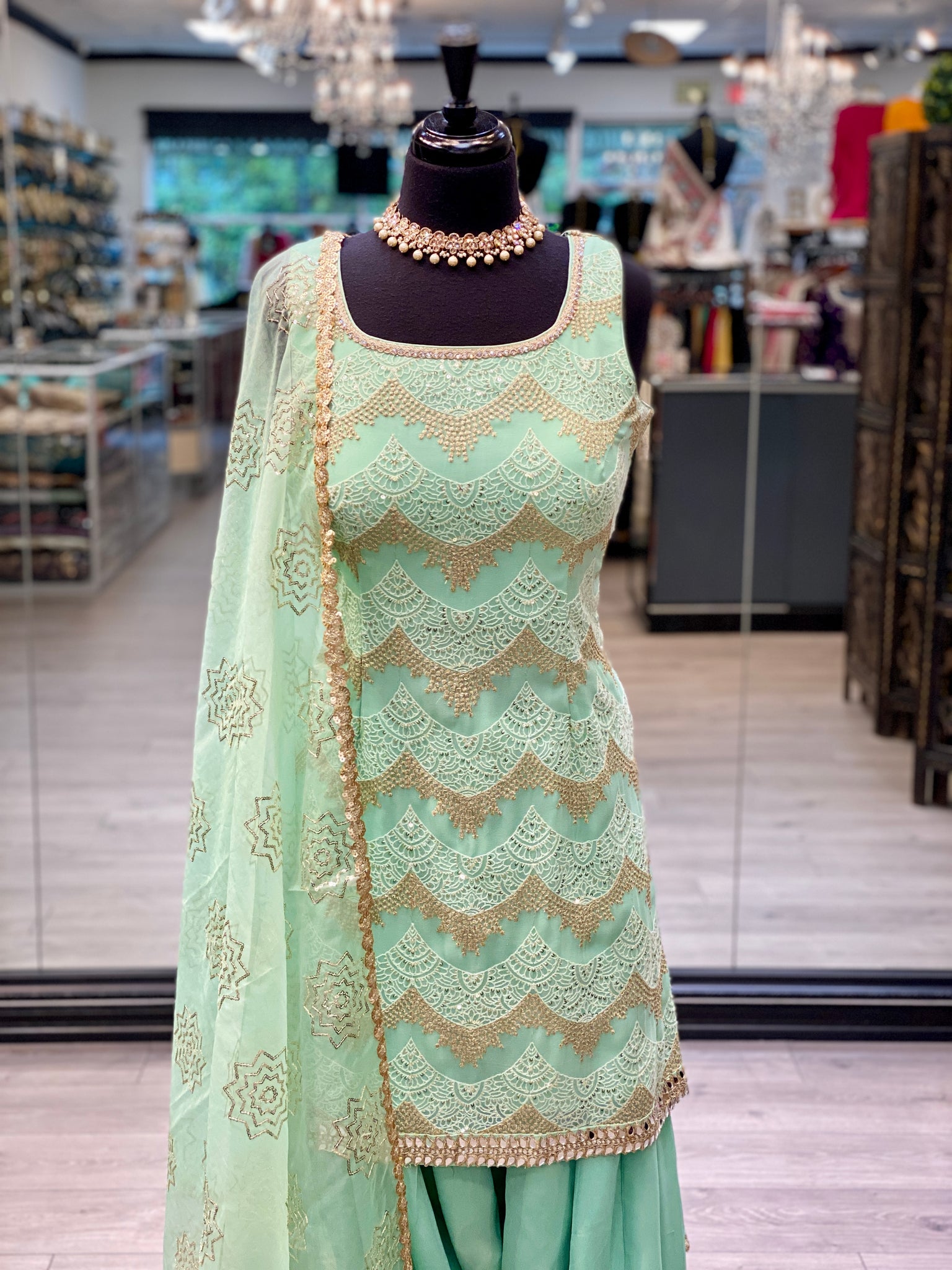 An elegant mint green suit with sequins and gotta patterns all over the top along with georgette light weight salwar. The look is completed by organza embroidered sleeves and comes with matching sleeves fabric that can be attached as per preference.