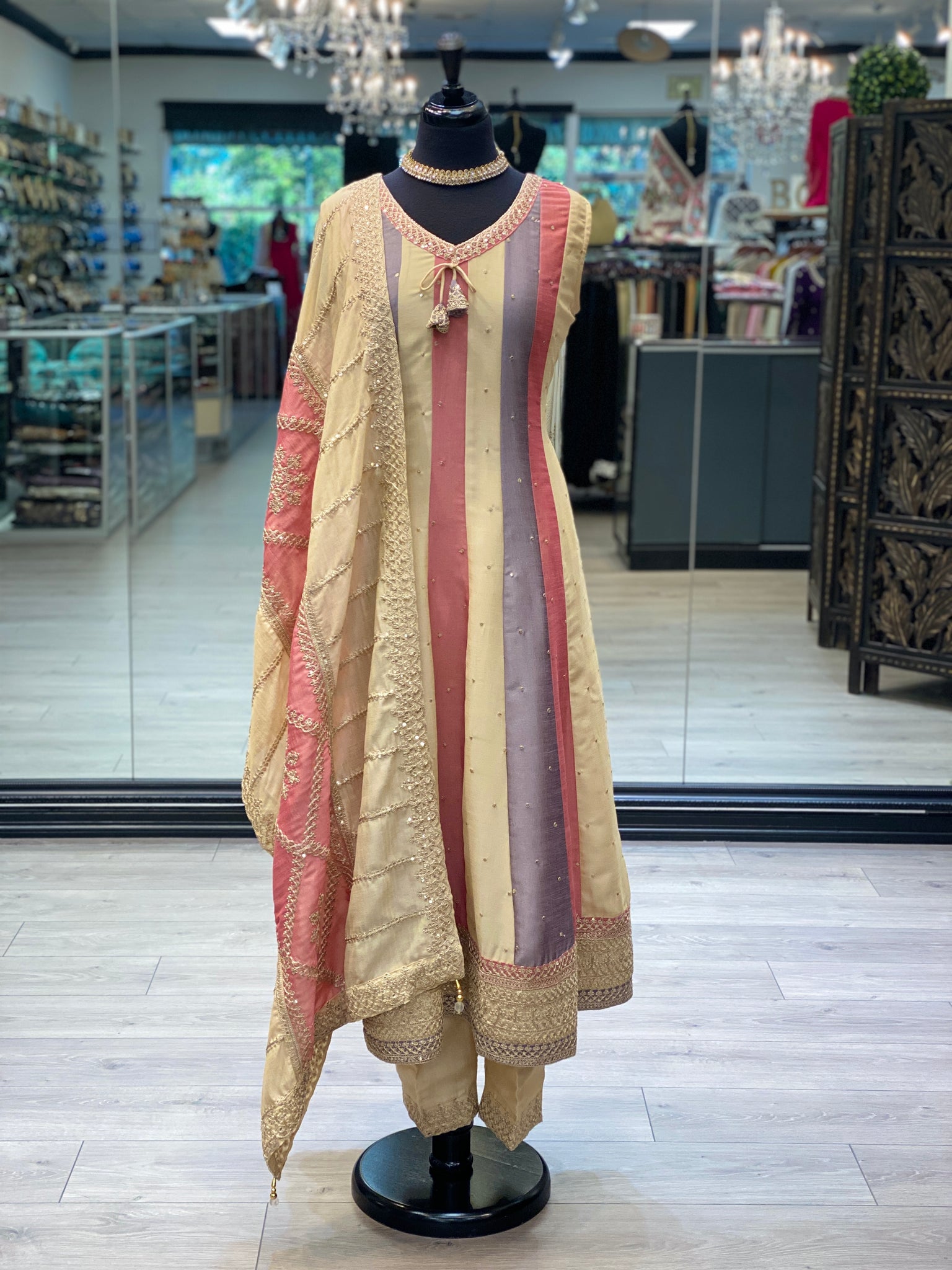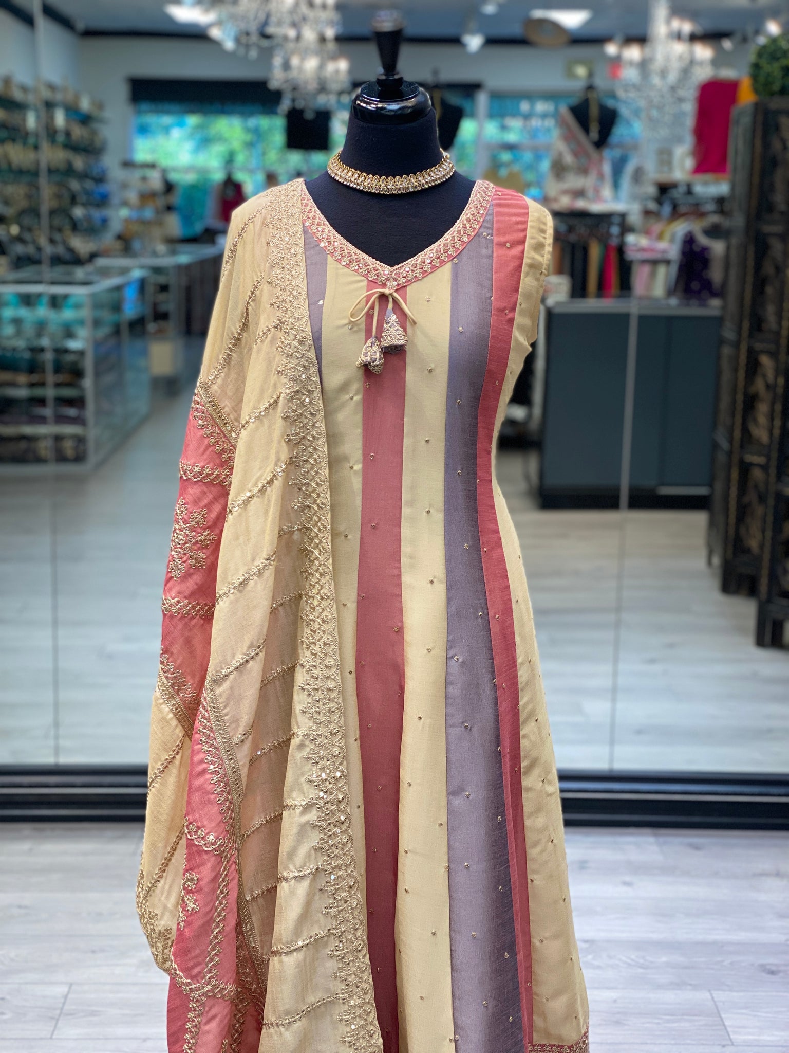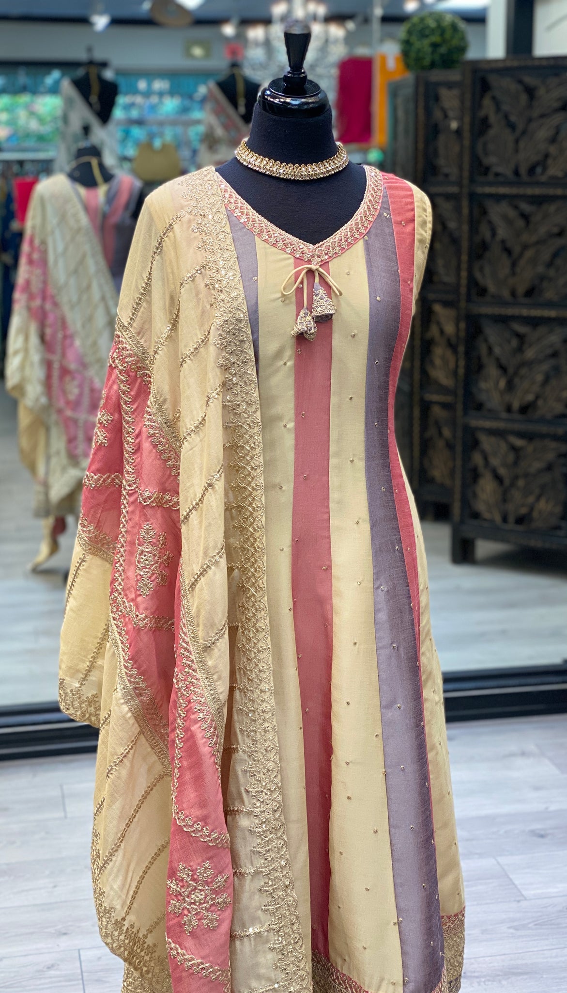 An elegant short anarkali with stunning pastel colour combinations along with gotta embroidery on the borders. The dupatta comes with detailed work which makes the look of the outfit. Last but not least, it includes pants and sleeves fabric to attach as per preference.