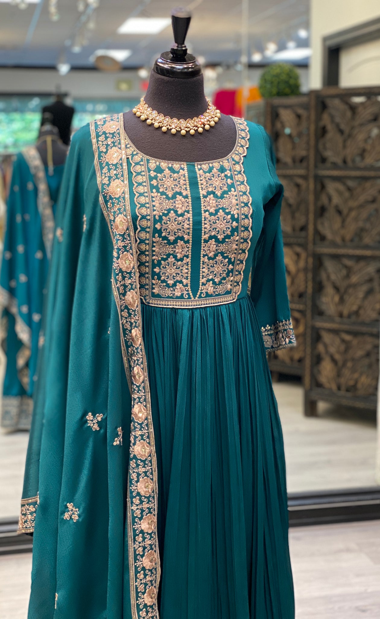 A simple and casual georgette anarkali in teal green colour with thread work and sequins.