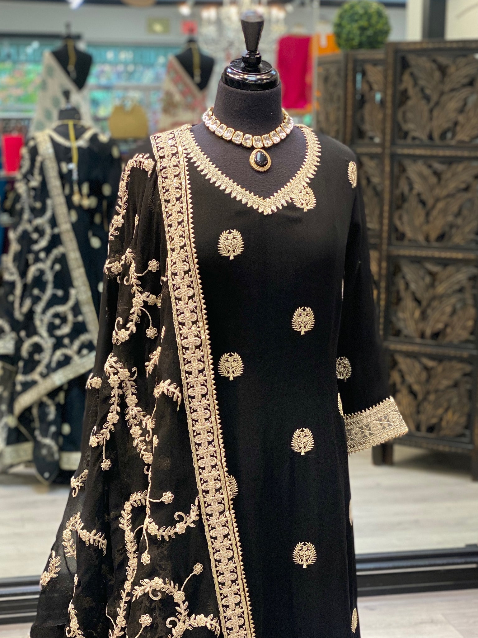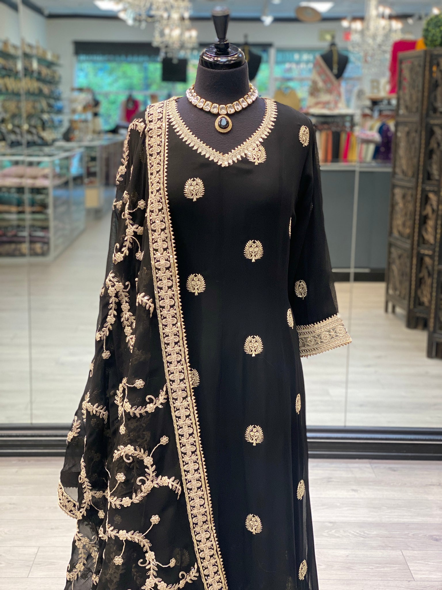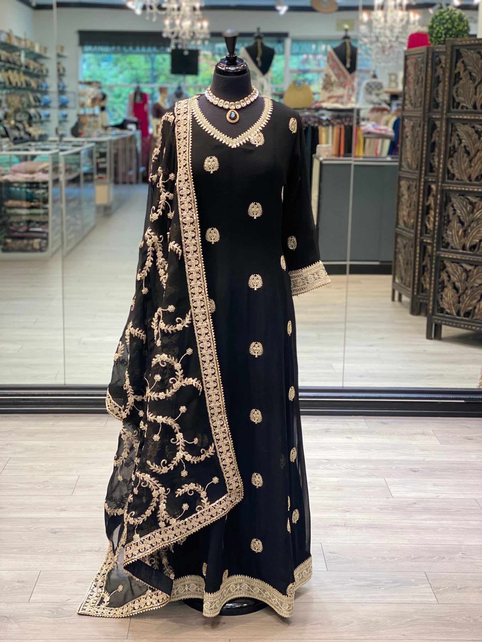 A stunning and evergreen black georgette anarkali with gotta patterns along with detailed work on dupatta making the outfit appealing. It includes black lycra tights.