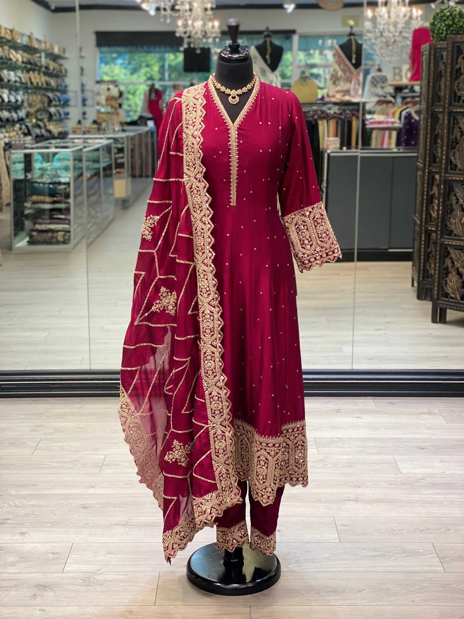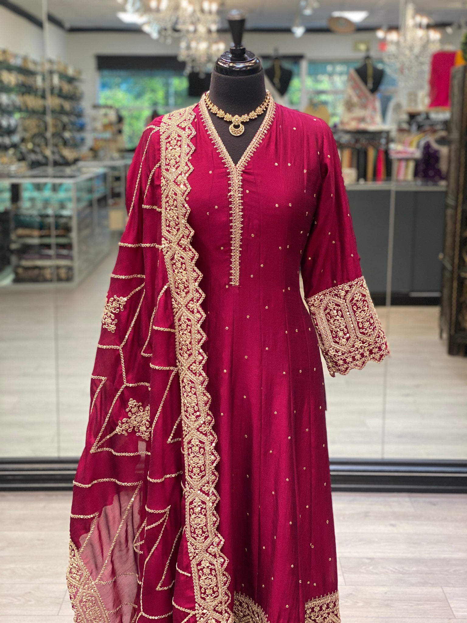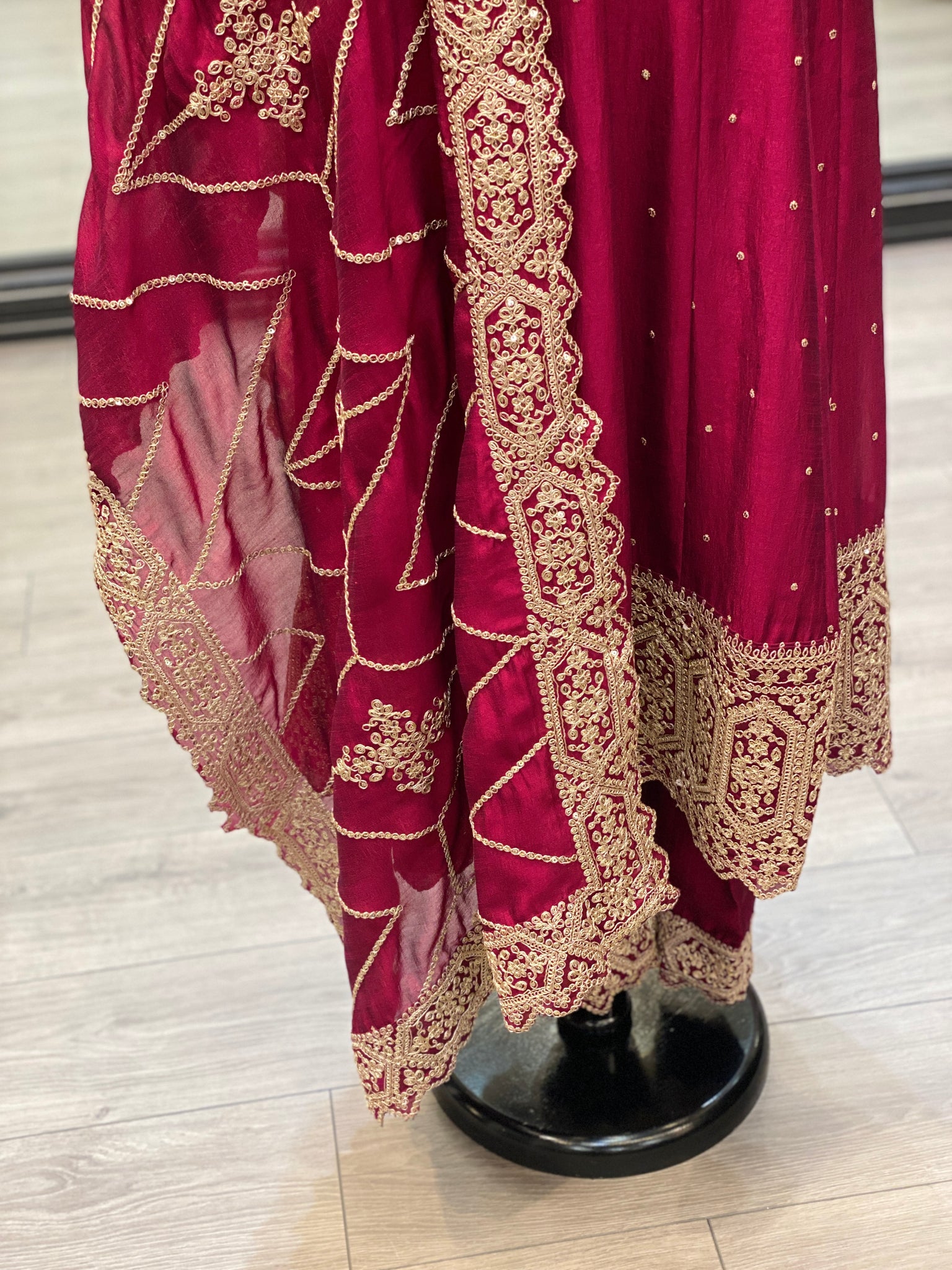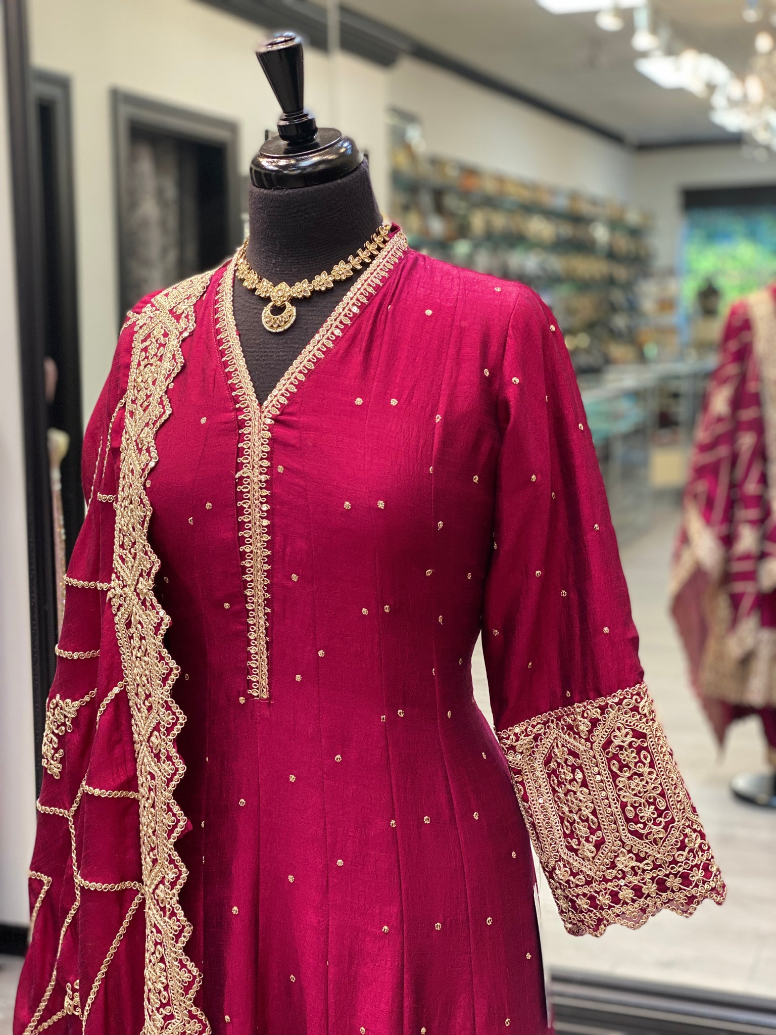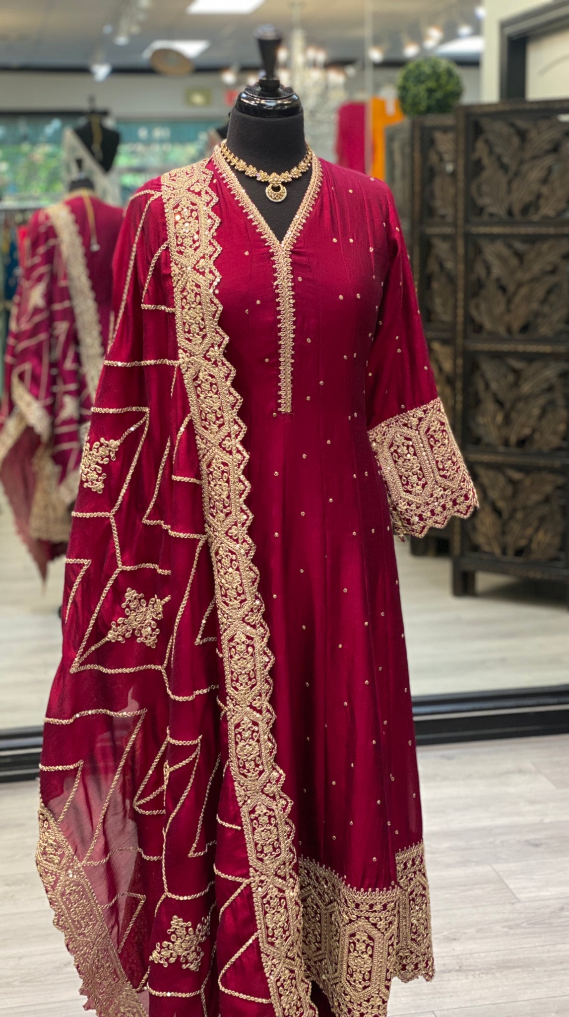 A stunning purple short anarkali with detailed gotta work on the outfit. It comes with gotta embroidered dupatta that makes the suit look appealing. The ensemble includes pants that have gotta border.