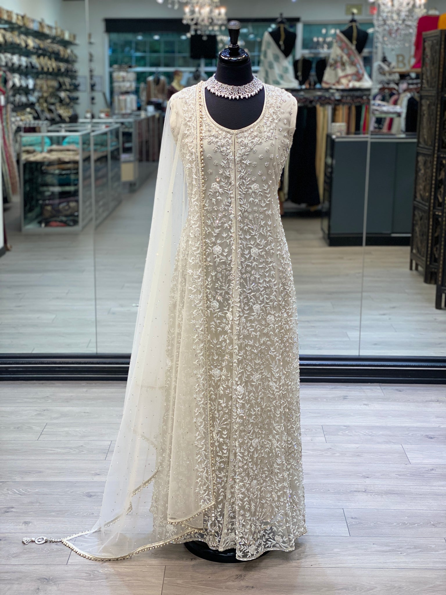 An absolutely gorgeous net anarkali with rhinestones all over. It comes with heavily hand embroidered jacket with detailed pearls and rhinestones. It includes matching net dupatta and net sleeves along with lining for the sleeves and last but not least lycra tights.